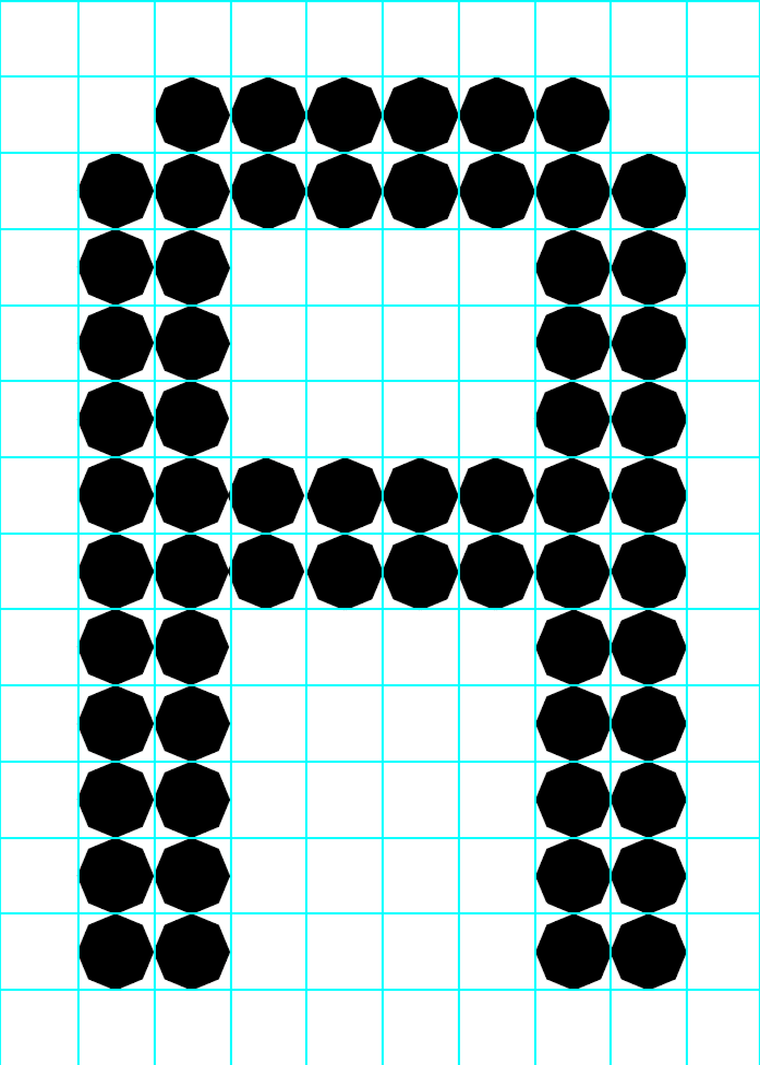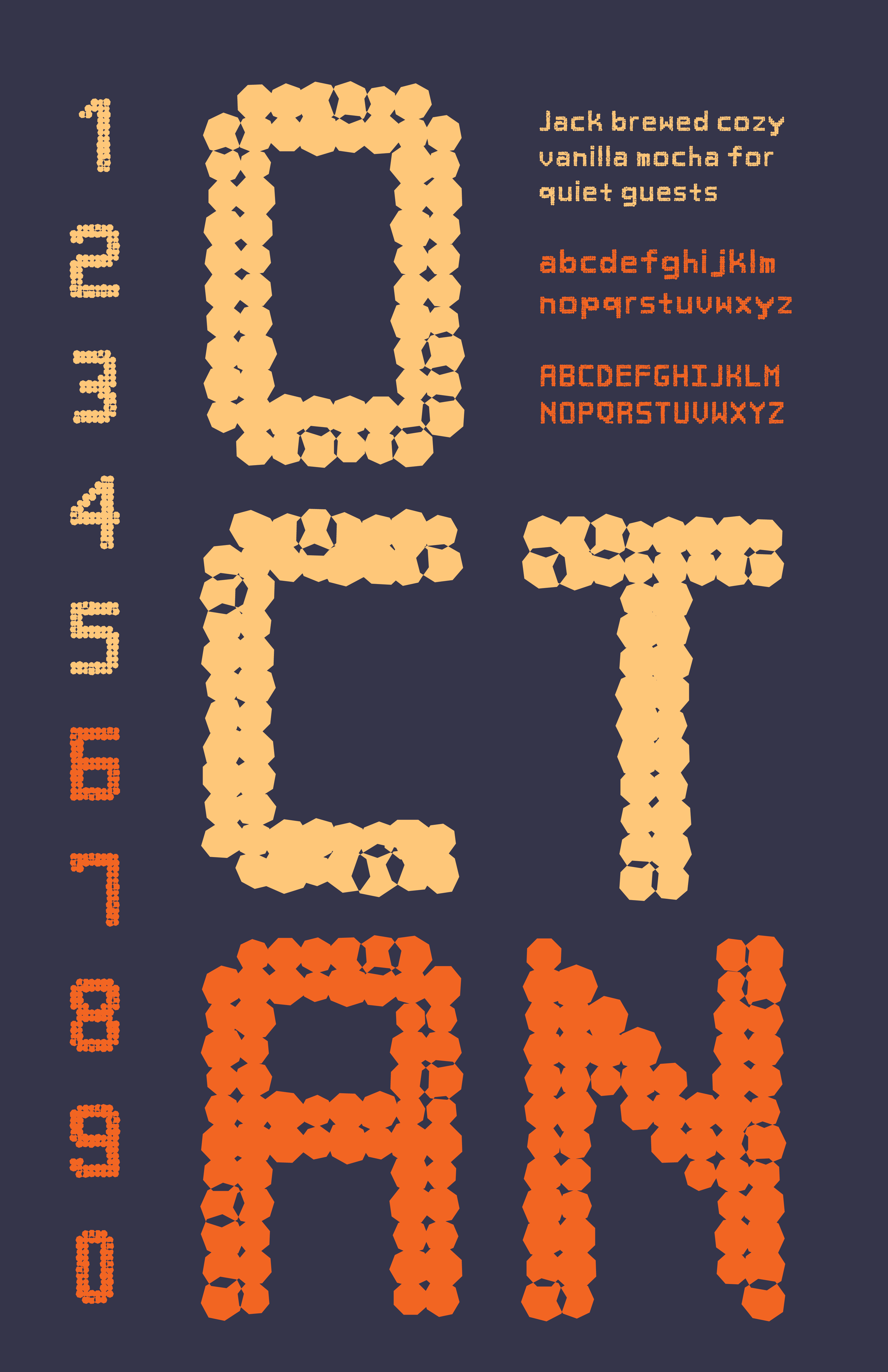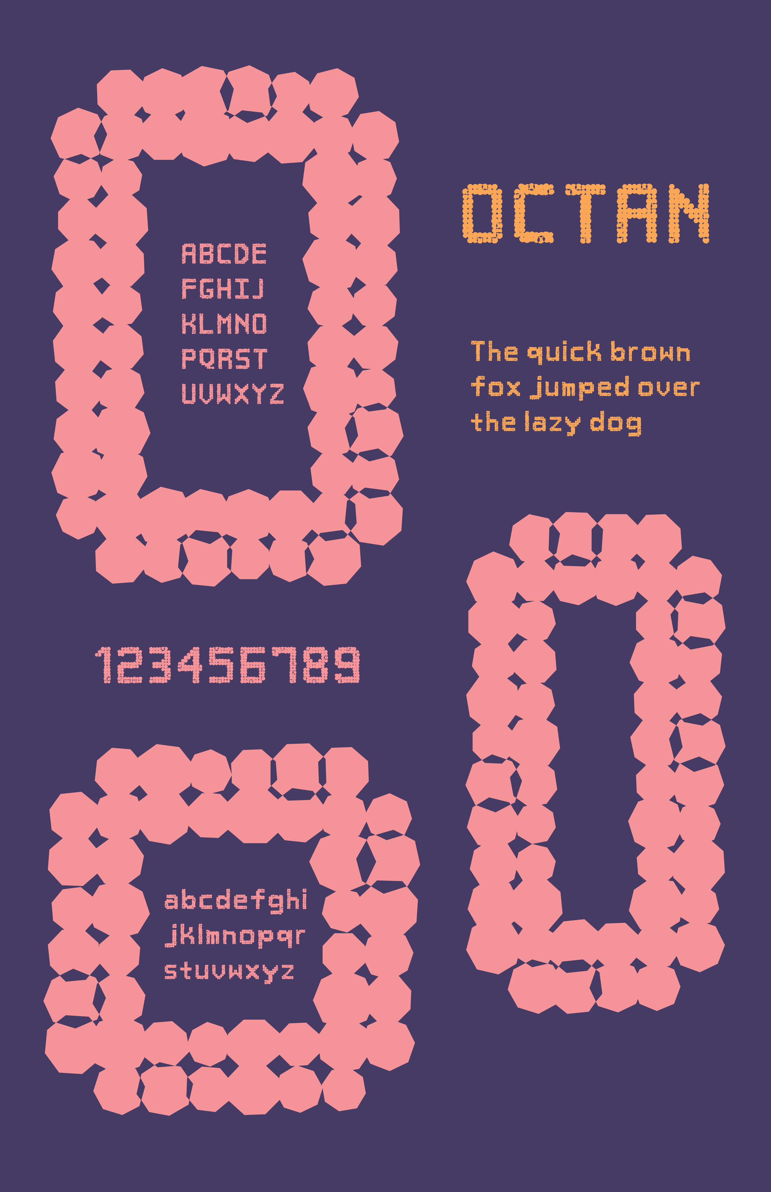 This process started in Adobe Illustrator where I made art boards that were 1000 by 1400 pixels. I made a grid using guidelines to divide the space into 10 columns and 14 rows. I chose to use octagons to construct each letterform. Once the letters and numbers flowed together cohesively, I used the transform each tool to further develop a more unique design. Experimenting with random tool, along with the horizontal and vertical scaling, allowed me to enlarge and manipulate the octagon shapes. This allowed for a more dynamic and expressive typeface to be developed.